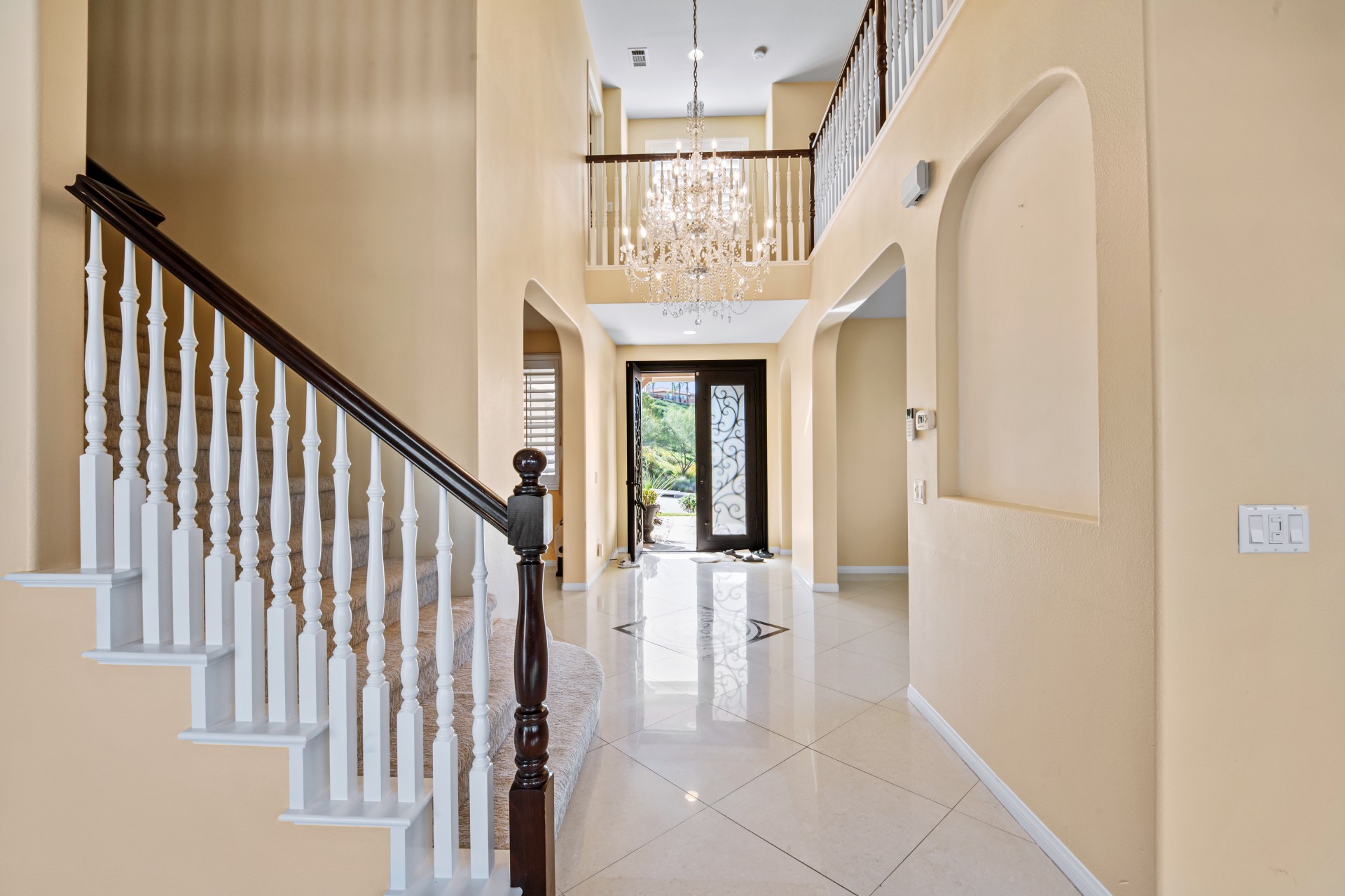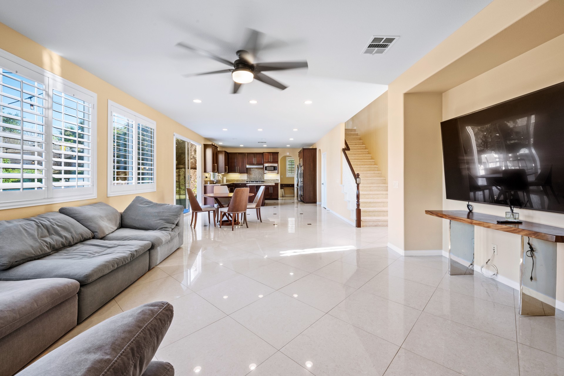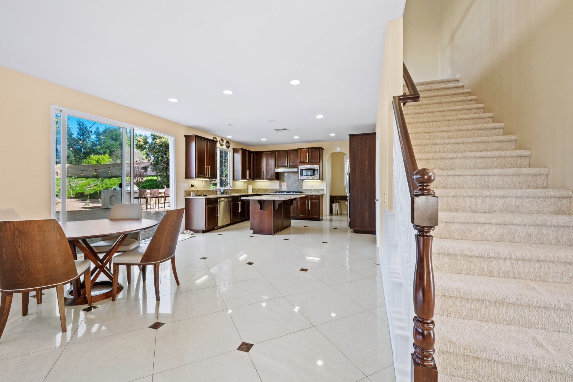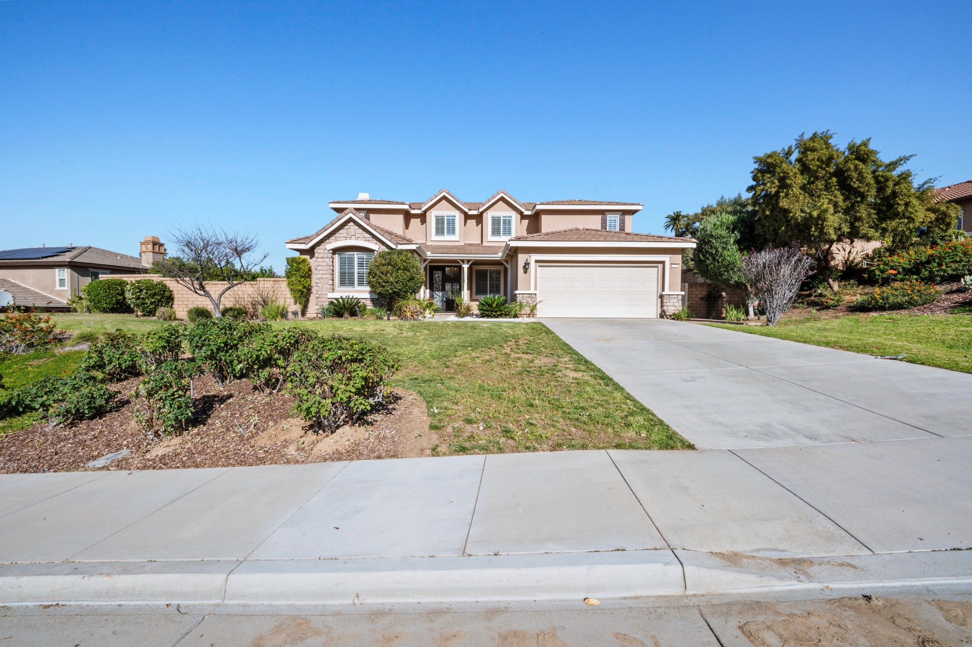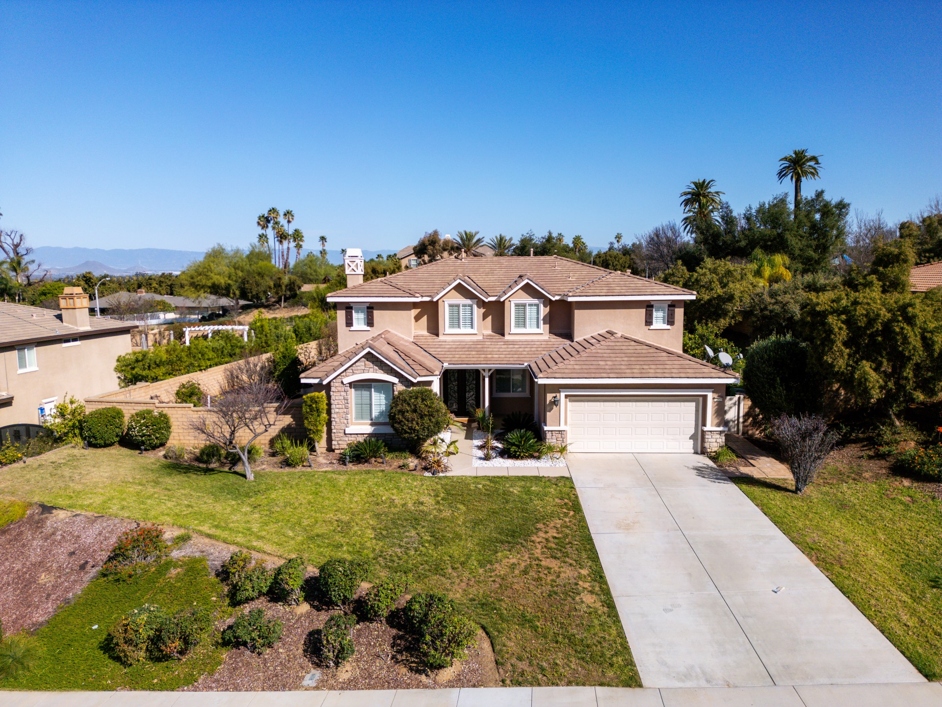 Nestled within the prestigious Sierra Bella community, this magnificent estate presents an unparalleled blend of elegance, space, and serene, fruit-filled privacy. Situated on a sprawling half-acre lot with beautifully landscaped gardens and many fruit trees, this home offers over 3,200 square feet of thoughtfully designed living space, perfect for both grand entertaining and comfortable family living. A grand formal entry, illuminated by a stunning chandelier, welcomes you and flows effortlessly into the formal living and dining rooms—ideal for hosting memorable gatherings. The heart of the home is an expansive great room, featuring rich 24″x24″ porcelain tile, a cozy fireplace, and abundant recessed lighting. It opens seamlessly into a chef’s dream kitchen, complete with a large island, walk-in pantry, granite countertops, and stainless-steel appliances including a double oven and 5-burner gas cooktop. The main floor also includes a convenient bedroom and full bath, perfect for guests or a home office. Upstairs, a versatile loft leads to three additional bedrooms, another full bath, and a breathtaking master suite. The master retreat features picturesque backyard views, a spa-like bath with dual vanities, a soaking tub, separate shower, and his-and-hers walk-in closets. Additional highlights include a downstairs laundry room and a spacious 3-car garage. Located just minutes from the 91 Freeway, La Sierra Metrolink Station, and the California Citrus State Historic Park, this home provides easy connectivity to Orange County and Los Angeles while offering a peaceful, private sanctuary. Don’t miss the opportunity to own this exceptional Sierra Bella residence. Schedule your private tour today!