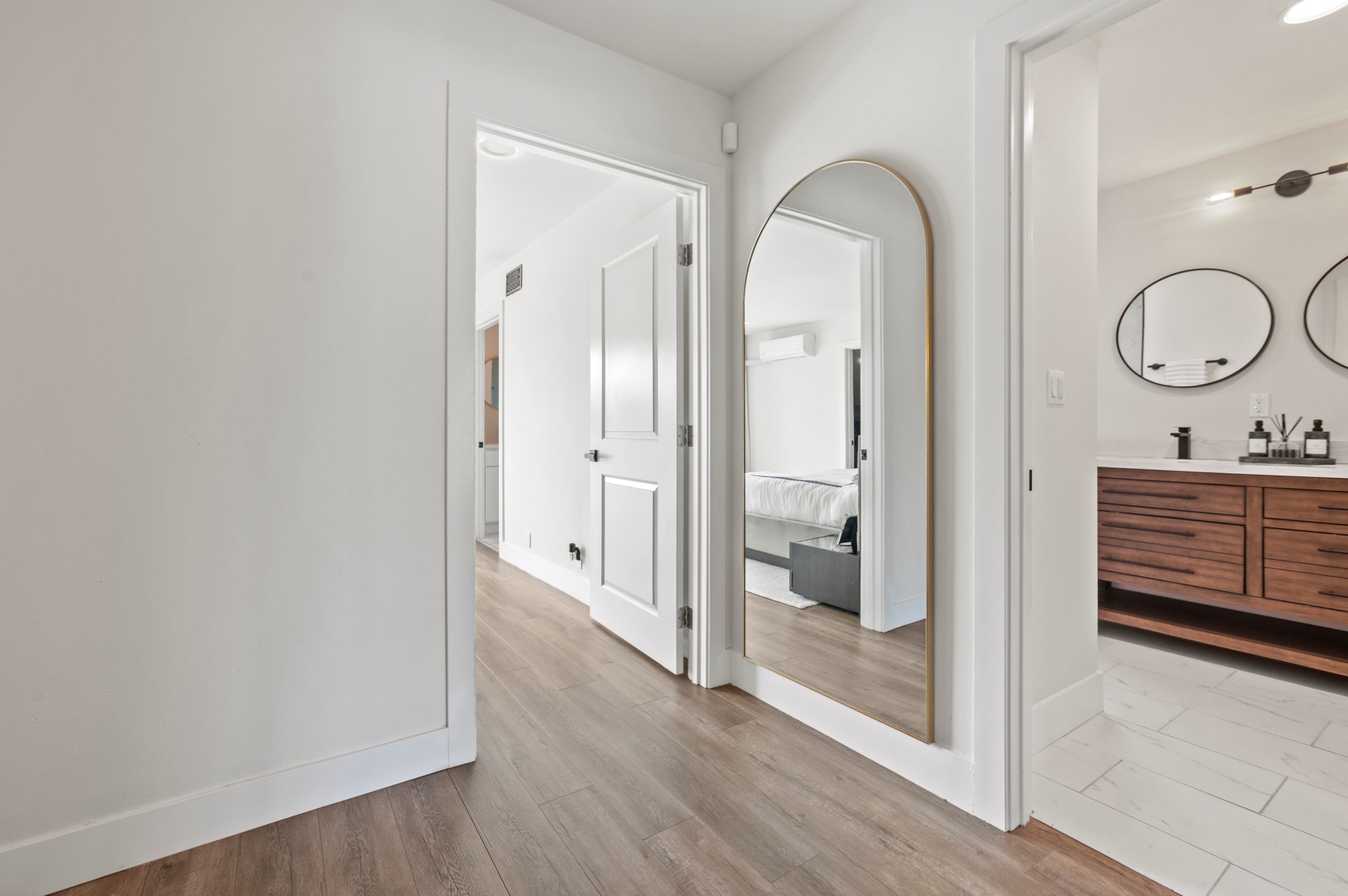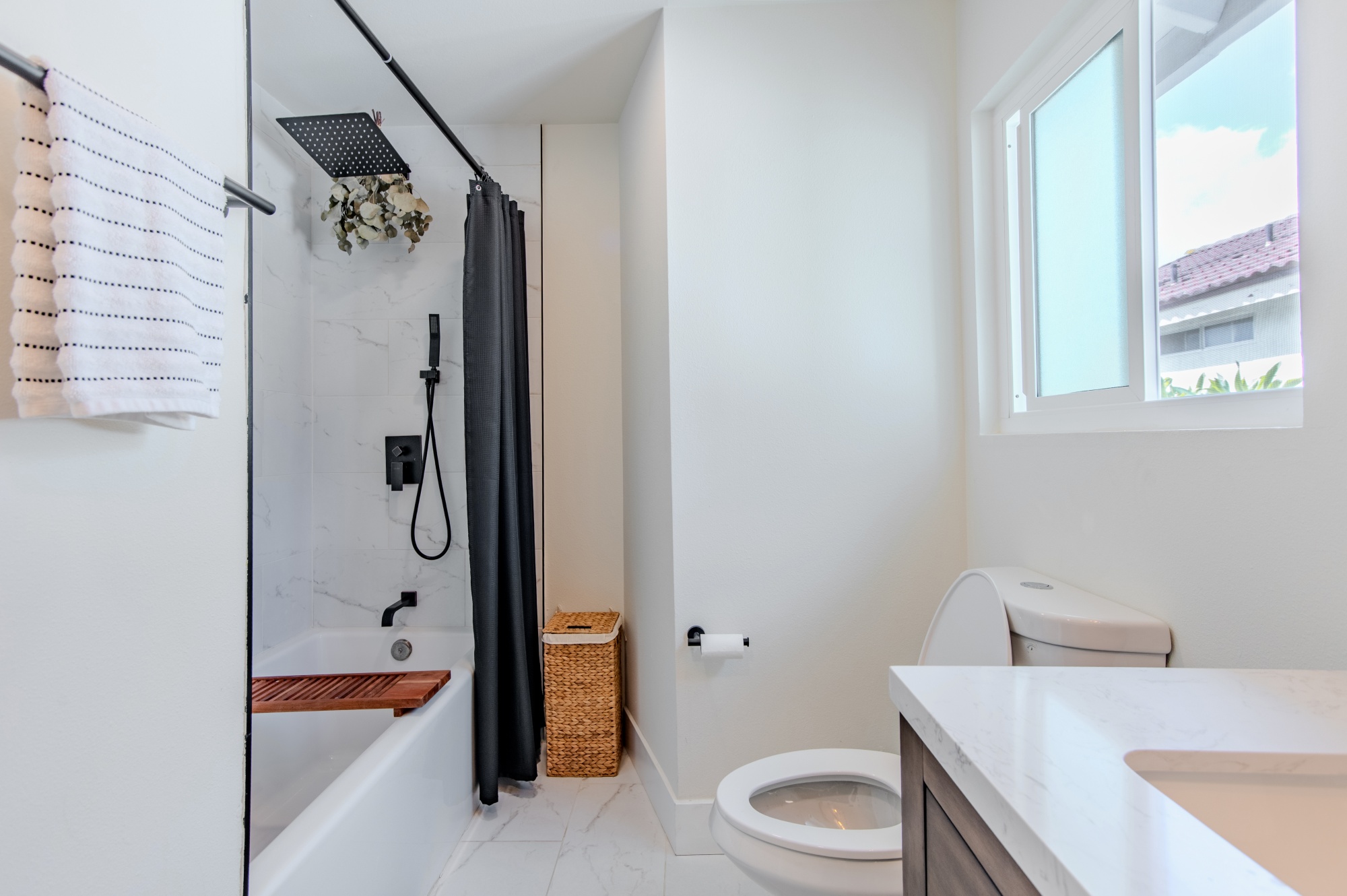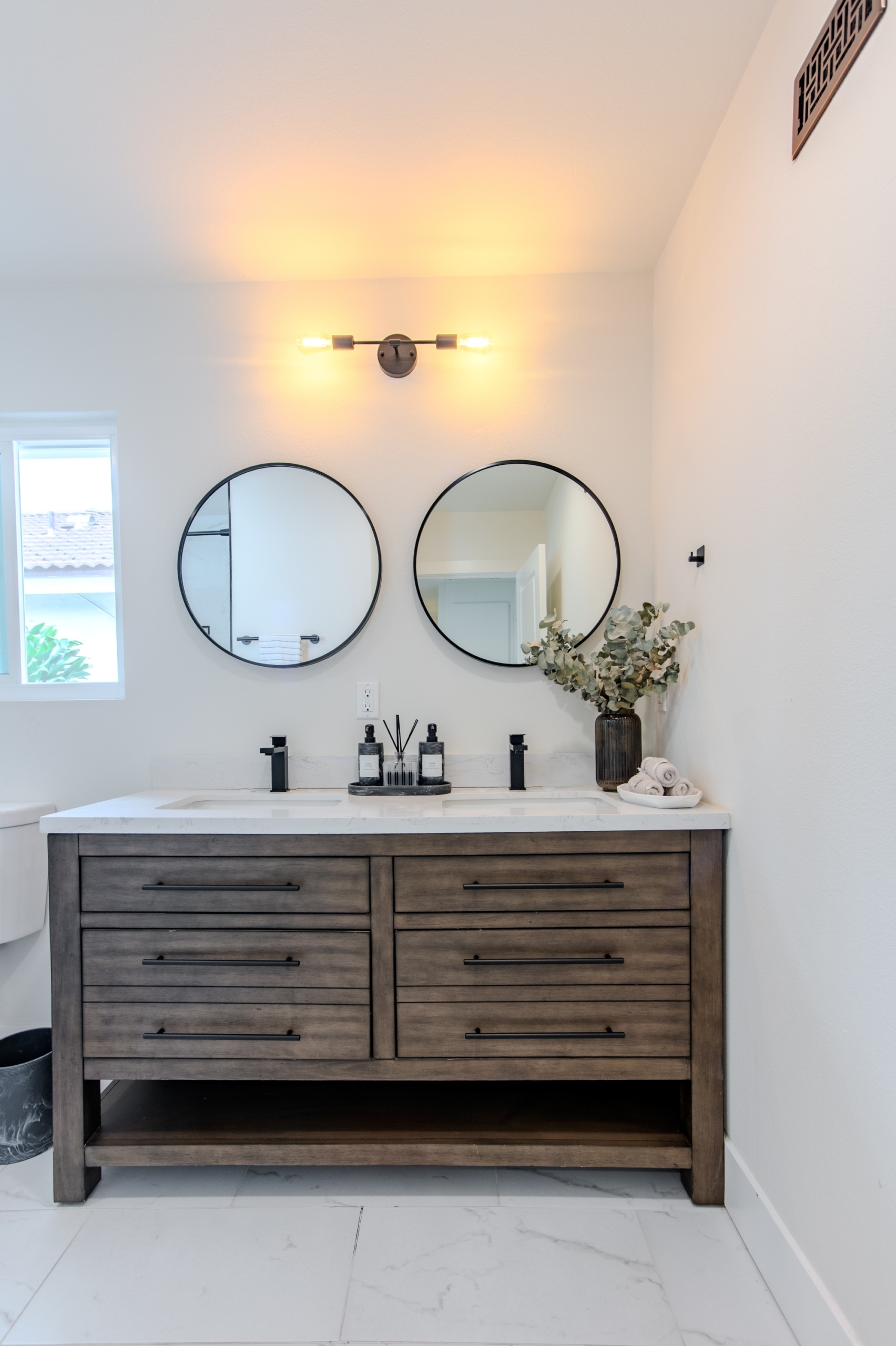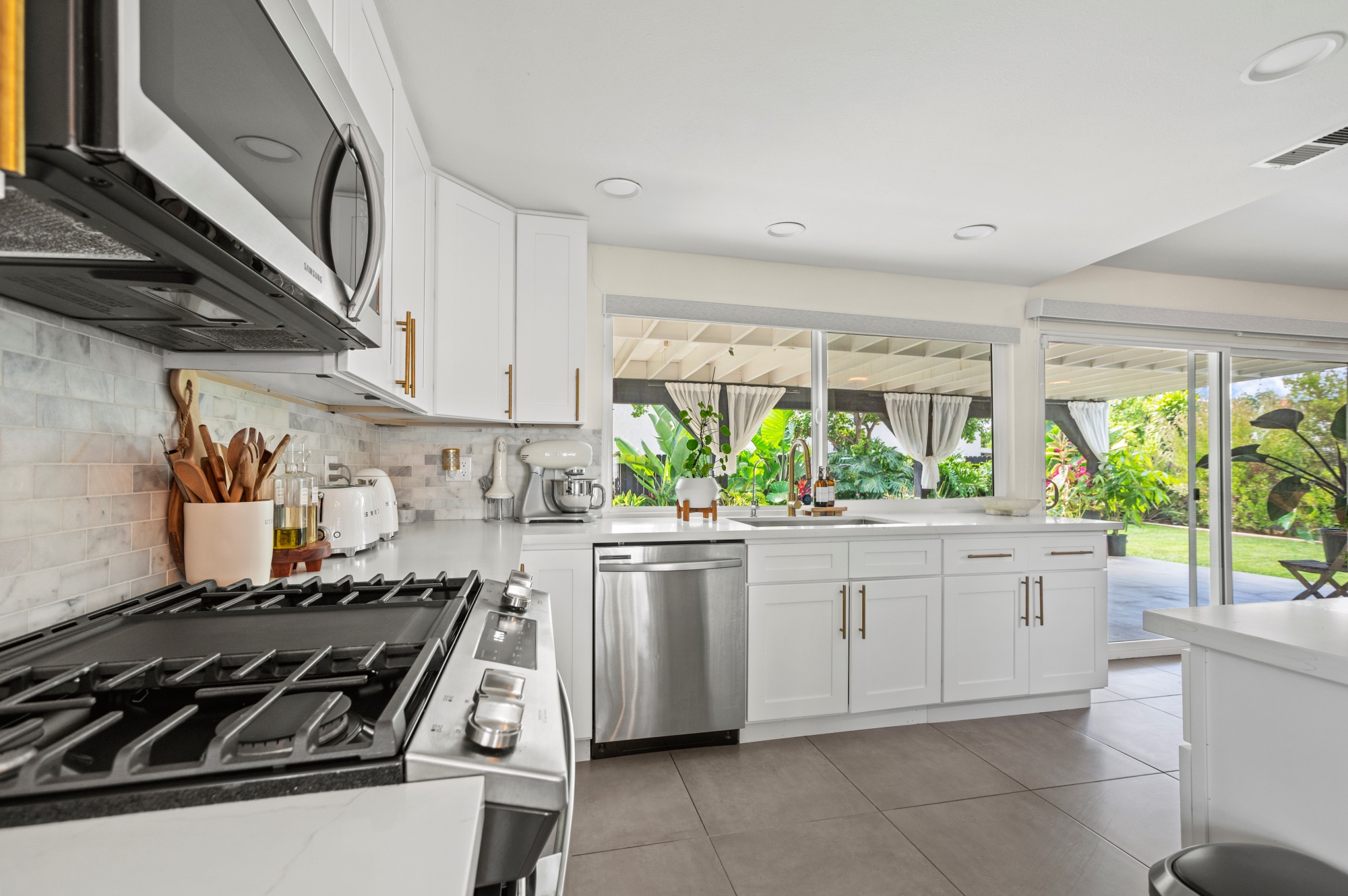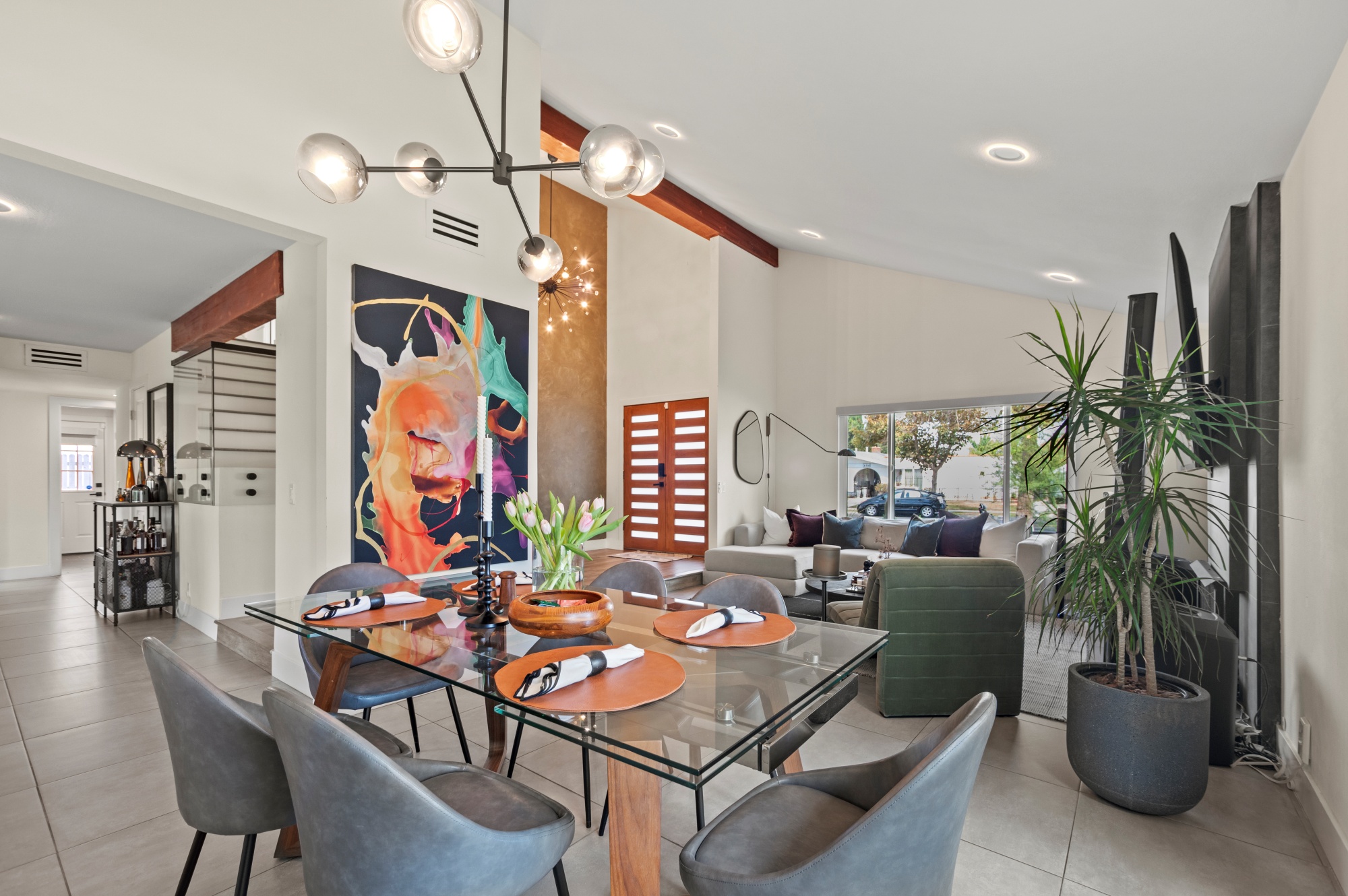 Modern Living on a Spacious Corner Lot – Fully Renovated & Move-In Ready! Set on a desirable corner lot, this beautifully upgraded home offers a rare blend of style, comfort, and functionality in a prime location. From the moment you arrive, you’ll notice the newly designed front and rear landscaping, along with a private backyard and an expansive second-story deck—perfect for entertaining guests or unwinding in peace. Step inside to a bright, open interior featuring brand-new tile flooring on the main level, luxury vinyl floors upstairs, and a striking hardwood staircase with a modern glass railing. The entire home is enhanced by recessed lighting and a custom-built entertainment center in the living room. The heart of the home is the fully remodeled kitchen, showcasing sleek quartz countertops, classic white shaker cabinets, and stainless-steel appliances—a true chef’s delight. All bathrooms have been tastefully renovated less than three years, offering a fresh, contemporary vibe. With four bedrooms and three full bathrooms, this home is designed with flexibility in mind. The layout includes a convenient downstairs bedroom and full bath—ideal for guests or multi-generational living—while upstairs you’ll find three additional bedrooms, including a spacious primary suite complete with a custom walk-in closet. Additional highlights include Built-in water softener, new window blinds, Quiet Street location near Sandpointe Park, just 5 minutes from South Coast Plaza, Easy access to the 405, 55, and 73 freeways. This is more than just a house—it’s a thoughtfully upgraded home in one of the area’s most convenient neighborhoods. Don’t miss your chance to own this turnkey gem!